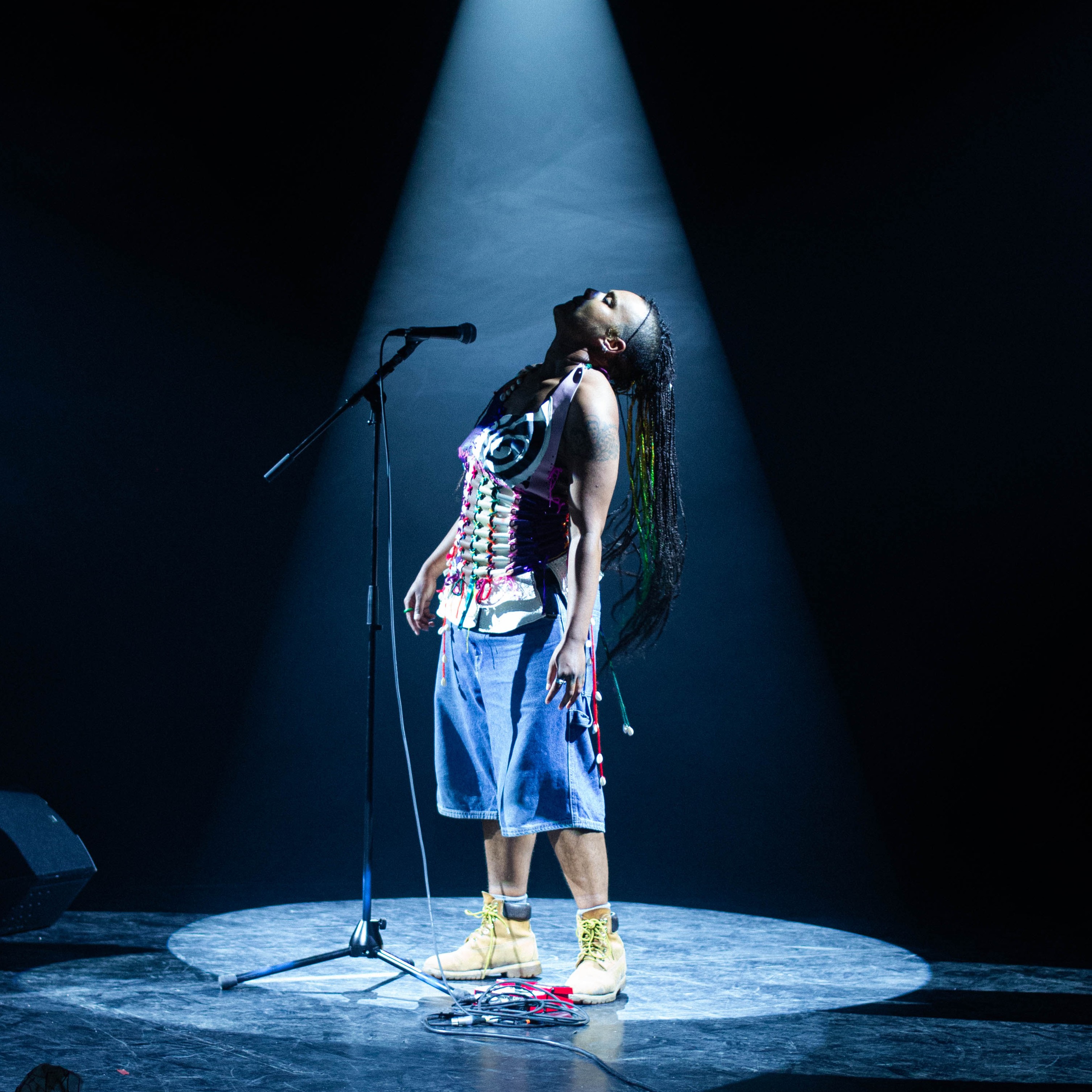 Sa pratique chorégraphique entend aller au-delà de la danse et au-delà du corps humain, pour questionner la crise écologique, la fétichisation techno-scientifique, ainsi que les pouvoirs hégémoniques qui standardisent les formes de vie, les corps, les alliances et les savoirs.